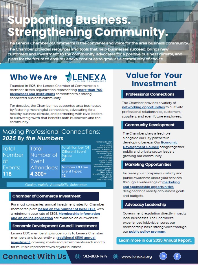 The Lenexa Chamber of Commerce is a not-for-profit membership organization consisting of businesses who care about our growing community. We coordinate ideas, energy, and financial resources to accomplish collectively what none of us could accomplish individually. We exist to promote economic growth in Lenexa, to provide members with the resources and tools necessary for their businesses to succeed, and to affect public policy decisions to the benefit of the Lenexa business community.